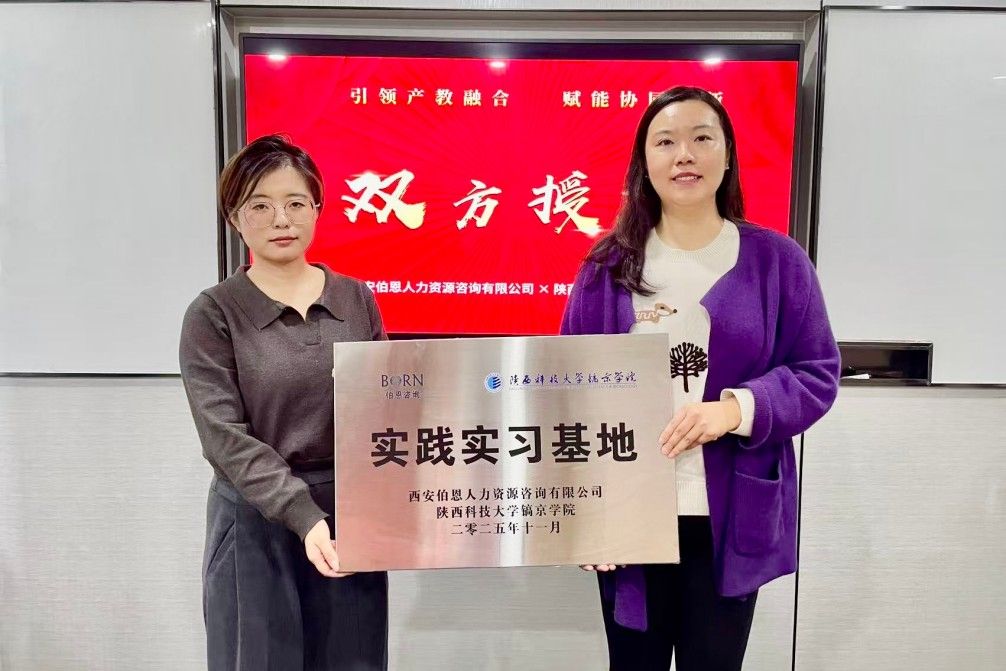 2025年11月7日,陕西科技大学镐京学院人力资源管理专业教研室专任教师杨琪、张晨与西安伯恩人力资源咨询有限公司业务负责人李夏、项目经理李庆慧、人事专员许文杰共同出席实习基地签约授牌仪式,正式开启双方在人力资源专业人才实践培养领域的深度合作。