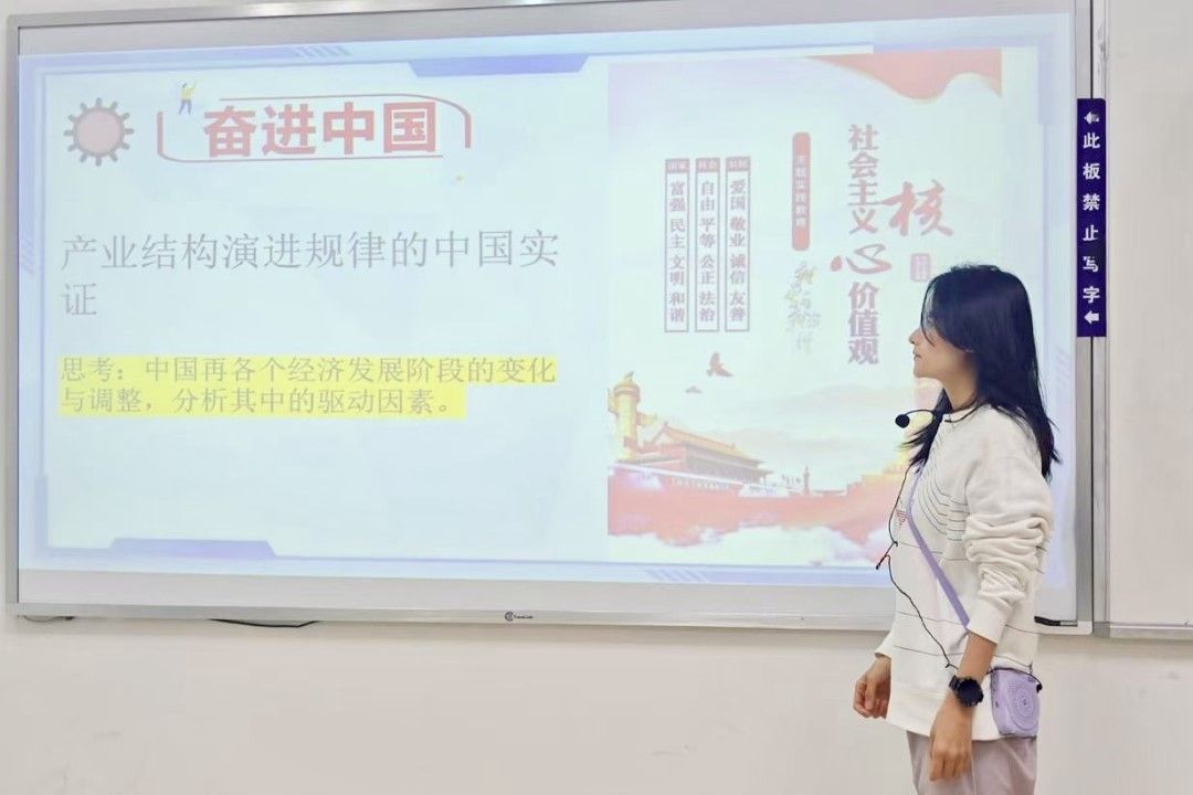 “奋进中国”模块,沈情老师聚焦产业结构演进规律的中国实证,以中国经济发展阶段为脉络,从中华人民共和国成立初期农业产值占比超50%,到改革开放后制造业的世界工厂崛起,再到如今数字经济、现代服务业的蓬勃发展,引导学生深入思考技术进步、政策支持、市场需求变化等驱动因素的作用机制。通过剖析长三角制造业升级、珠三角产业转型等区域案例,让学生清晰看到产业结构调整如何带动经济增长质量提升、促进就业结构优化,在理论应用中培育职业理想与科学精神,深化对社会主义核心价值观的理解。