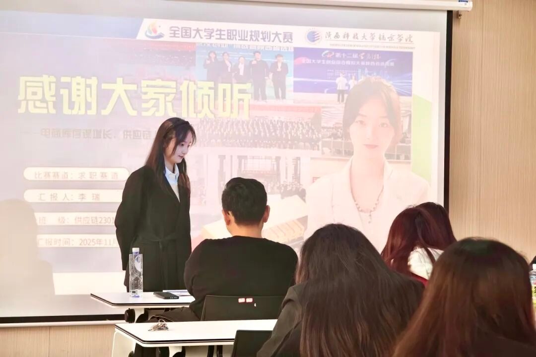 在成长赛道,选手们聚焦个人长期成长,以“职业目标锚定—学习实践落地——优化改进迭代”为核心逻辑展开展示。他们不仅清晰勾勒出未来3至5年的职业蓝图,更结合经贸专业特色,详述了专业课程学习、校园实践参与、校外实习积累的具体计划,让“规划”不流于形式、更具实操性。最终,苏欣彤凭借清晰的逻辑与扎实的规划斩获成长赛道第一名,郑若彤、胡晴悦分列第二、三名,杨慧慧、邹倩、陈召也凭借出色表现成功晋级校赛,尽显学子对未来的清晰思考与蓬勃干劲。