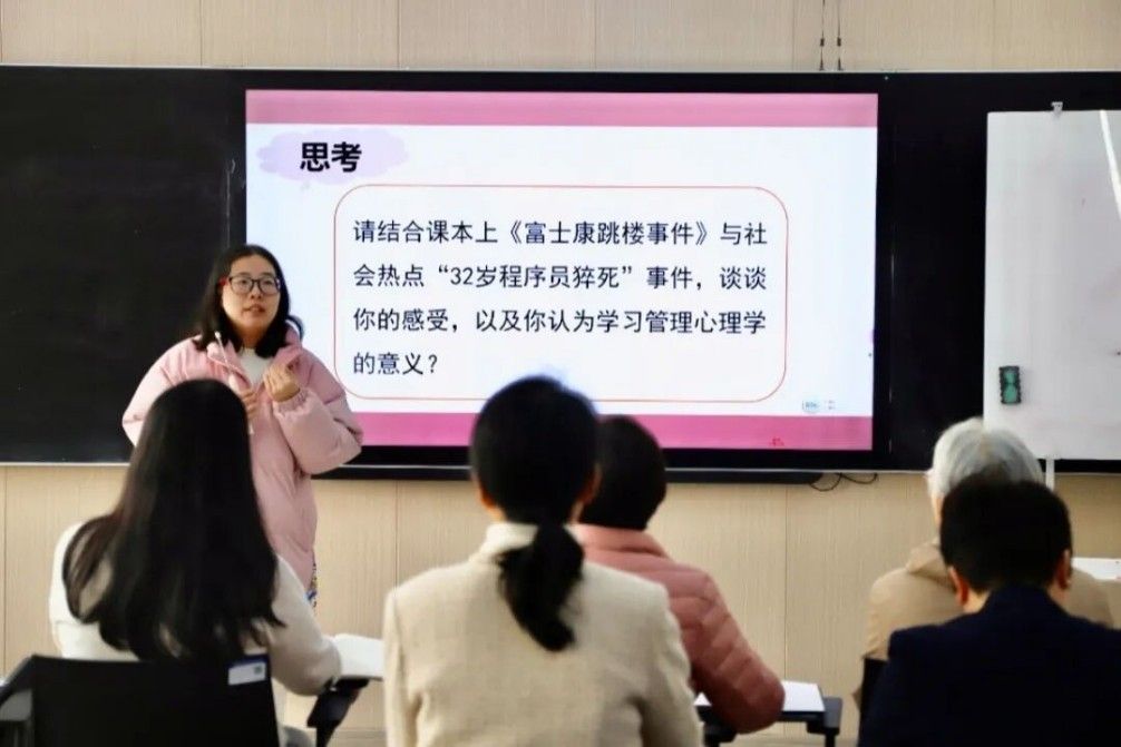本次教研活动分为两个主要部分,第一部分是新晋教师磨课试讲环节。蒲润思和李萌老师2025年加入人力资源管理专业教研室,二人不断通过磨课试讲,提高教学业务水平。蒲润思老师首先对《管理心理学》第一章进行了课堂讲授,她详细介绍了管理心理学的相关概念,并结合“富士康跳楼事件”与近期“程序员猝死”事件等实际案例,生动地阐述了学习管理心理学的重要性和现实意义,引入课程主题,课程设计中着重体现了国家对加强课程思政建设、培养学生综合素质的要求;李萌老师随后针对《职业生涯规划与管理》课程第一课进行了讲授,她详细介绍了课程的目标、教学要求以及课程导论,深入剖析了生涯及职业生涯的概念,并通过“生涯彩虹图”和“蚯蚓的目标阶梯”等丰富案例进行分析,提问互动轻松自然。