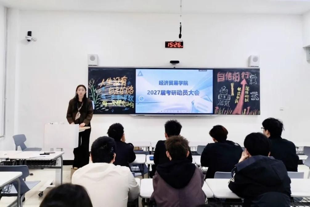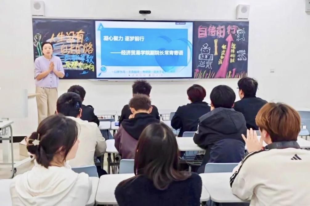为进一步夯实考研备考工作,引导学生及早明确升学目标、科学规划备考路径,全面提升学院人才培养质量,4月1日下午,我院于教学楼316教室召开2027届考研动员大会暨考研班开班仪式。会议由考研班主任田丹丹主持,经济贸易学院副院长常青主讲及2027届考研班全体同学共同参与。