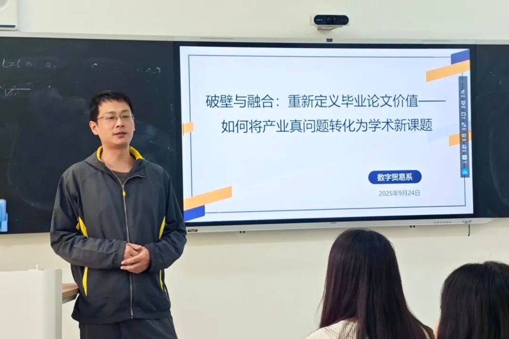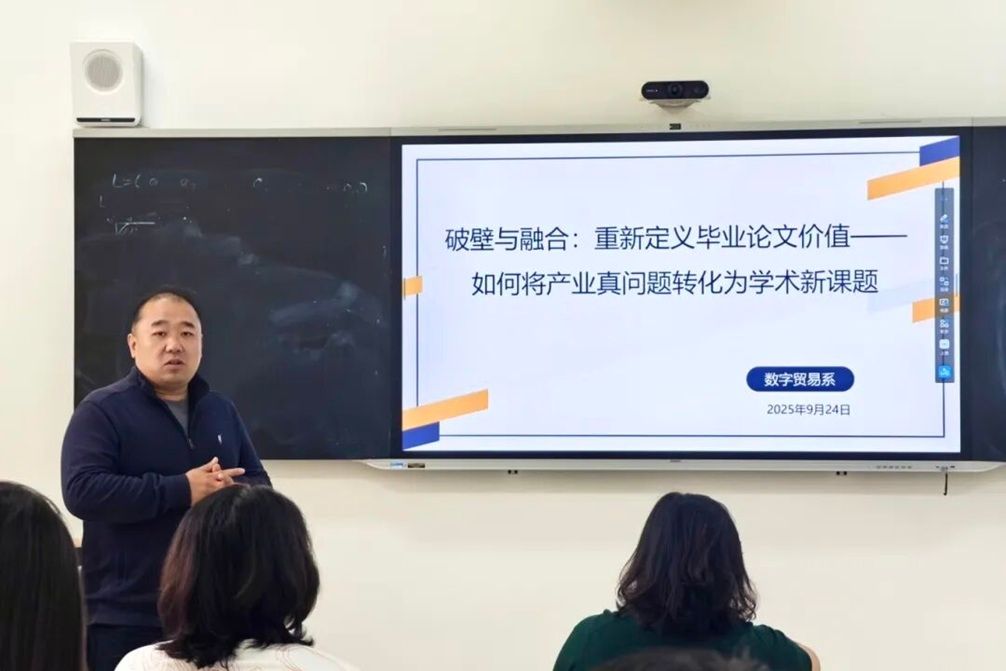 为打破学术研究与产业实践间的壁垒,推动毕业论文从理论走向应用,切实提升人才培养质量与学术研究的产业价值,2025年9月24日,数字贸易系以“破壁与融合:重新定义毕业论文价值——如何将产业真问题转化为学术新课题”为主题,召开专题教研会。本次会议由系主任杨哲老师主持,数字贸易系全体教师参会,围绕核心议题展开深入研讨,凝聚教学与科研协同发展新共识。