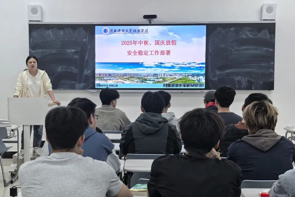 周天,全体辅导员面向所带班级召开“国庆中秋”安全稳定主题班会。会上,辅导员重点强调了节日期间交通安全、用火用电安全、网络安全等核心要点,提醒学生提高防范意识,同时明确了节日期间的请假报备流程,为双节安全保驾护航。