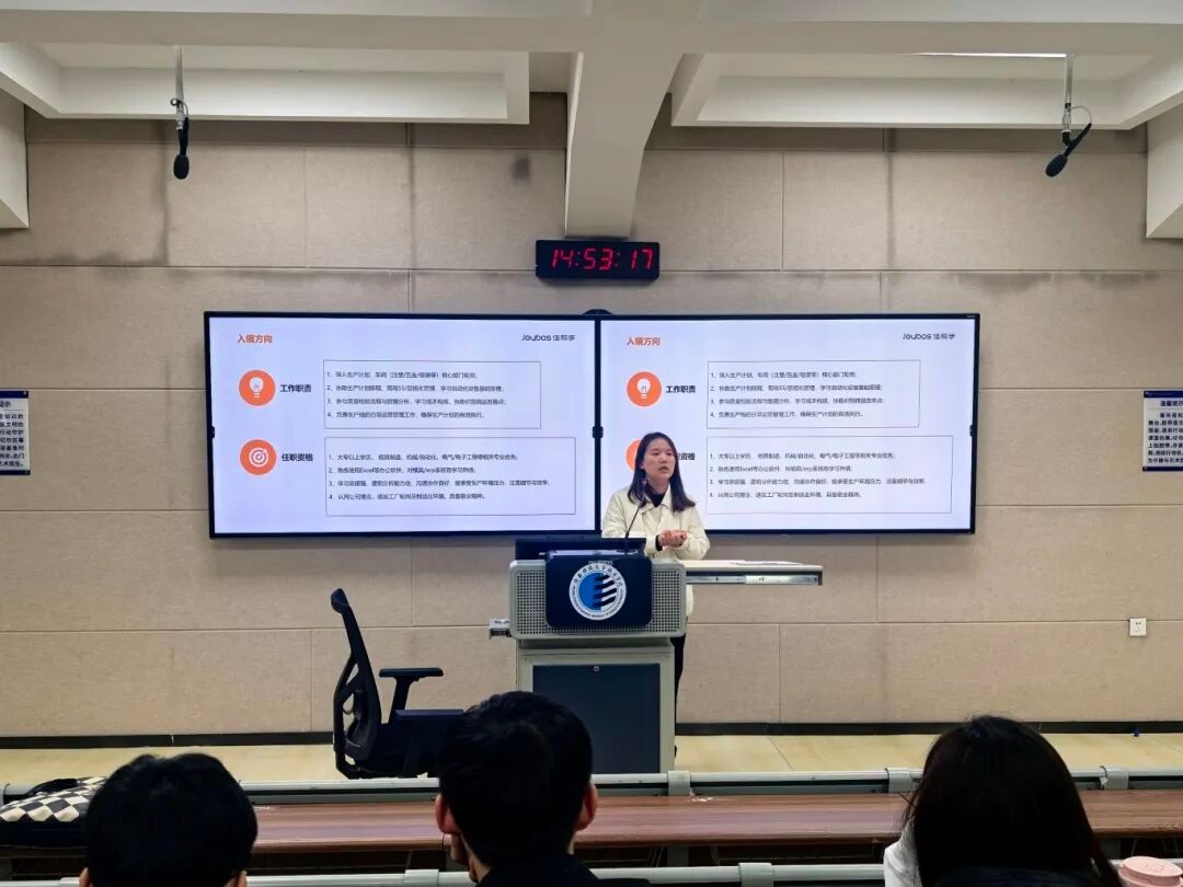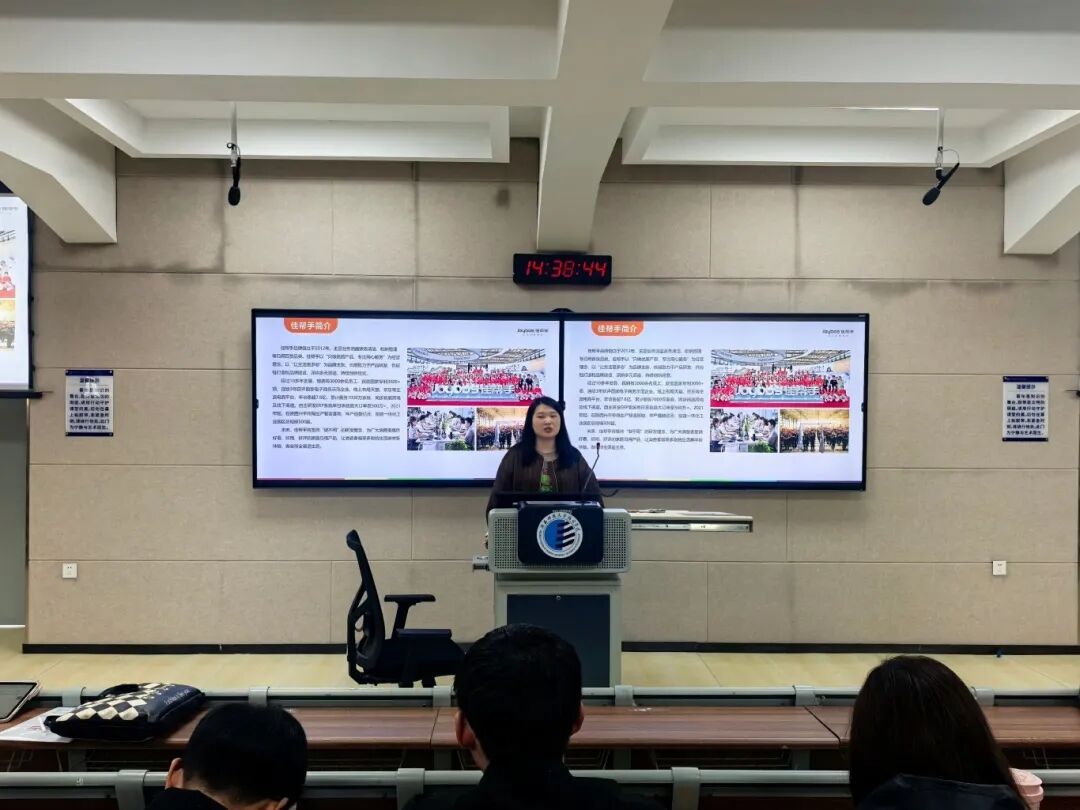 宣讲会伊始,李主管从发展历程、研发实力、生产规模及销售渠道四个方面介绍了公司概况。该公司成立于2012年,深耕清洁收纳领域,已构建起“研发—生产—销售”一体化全产业链;拥有陕西兴平500亩智能制造工厂,业务覆盖国内外主流电商平台,行业地位稳固。随后,宣讲会重点推出了三类精准对接学子需求的岗位:一是生产管理管培生,通过1-3个月集中培养,旨在快速培养为基层管理者,并提供向主管、厂长晋升的通道,薪酬竞争力强且提供免费食宿,随着明年7个新工厂的扩建,该岗位发展空间广阔;二是新媒体运营岗,涵盖短视频拍摄剪辑和直播带货两大方向,欢迎熟悉抖音平台、擅长内容创作与表达的同学加入,主播岗位底薪优厚并设有系统培训;三是行政与人资管培生,该岗位不限专业,要求具备高度耐心、细致度,并对职能类工作有浓厚兴趣。
