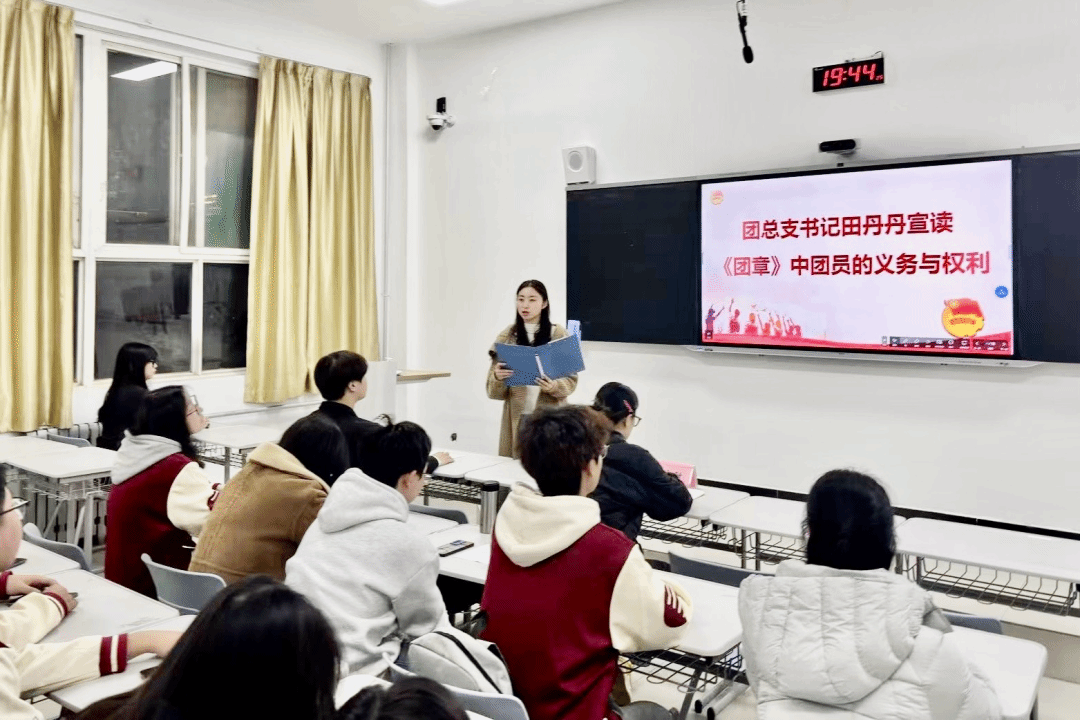 随后,在团总支志愿委员王子豪的带领下,新团员们高举右拳,庄严宣誓,誓言铿锵有力,掷地有声,饱含着对共青团的忠诚与为共产主义事业奋斗的坚定决心。紧接着,田丹丹老师逐字逐句解读团员章程,清晰阐释团员的权利与义务,帮助新团员们明确使命、坚守初心。