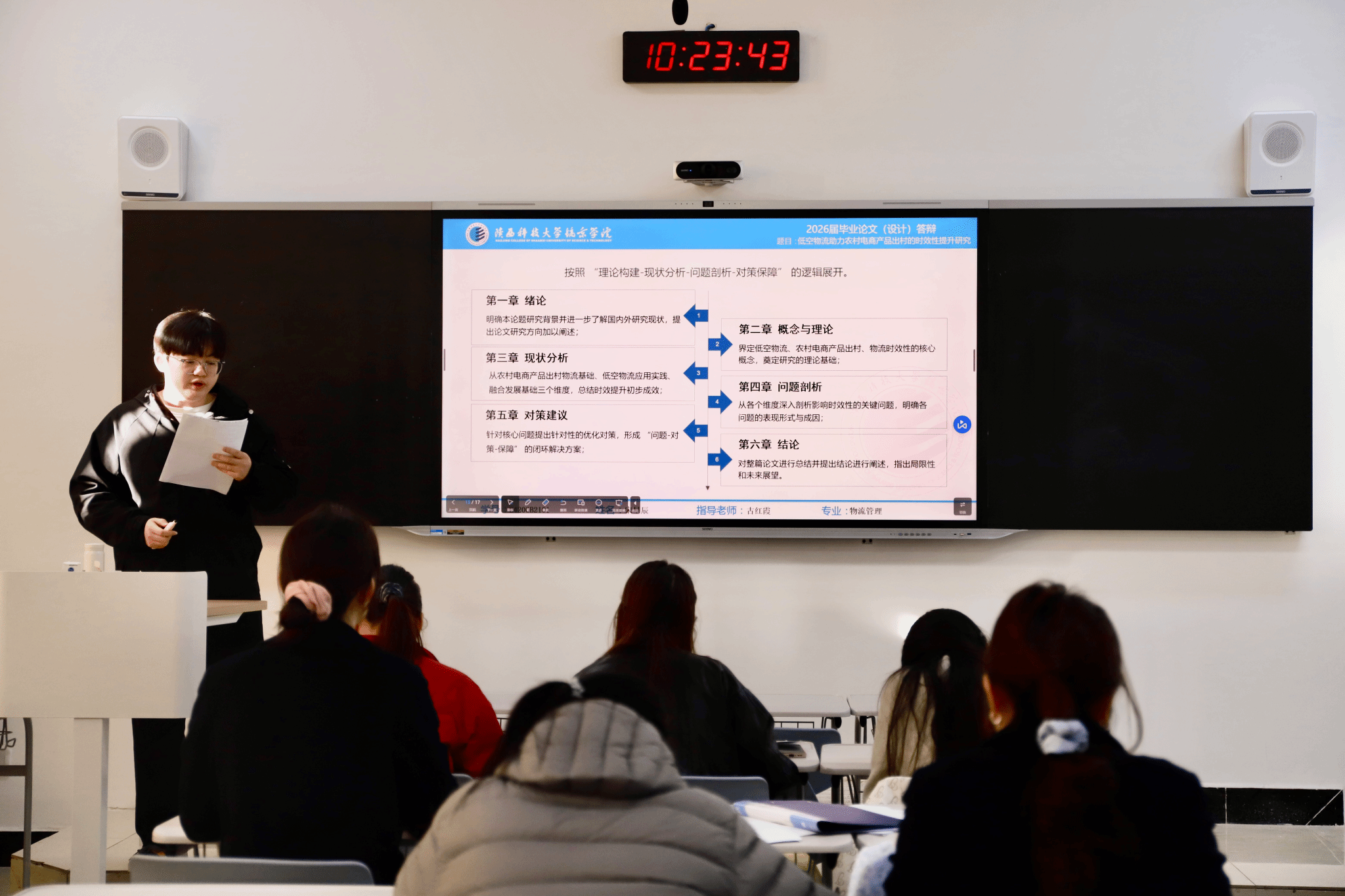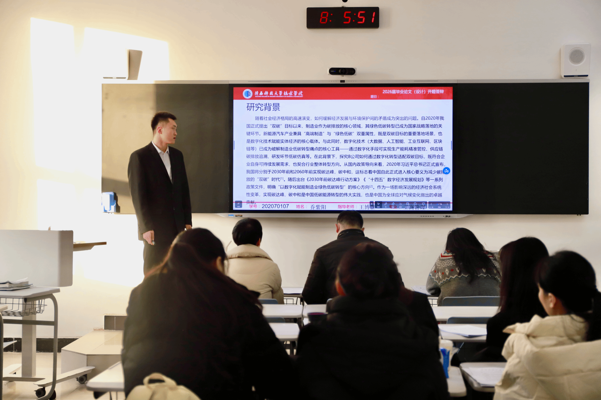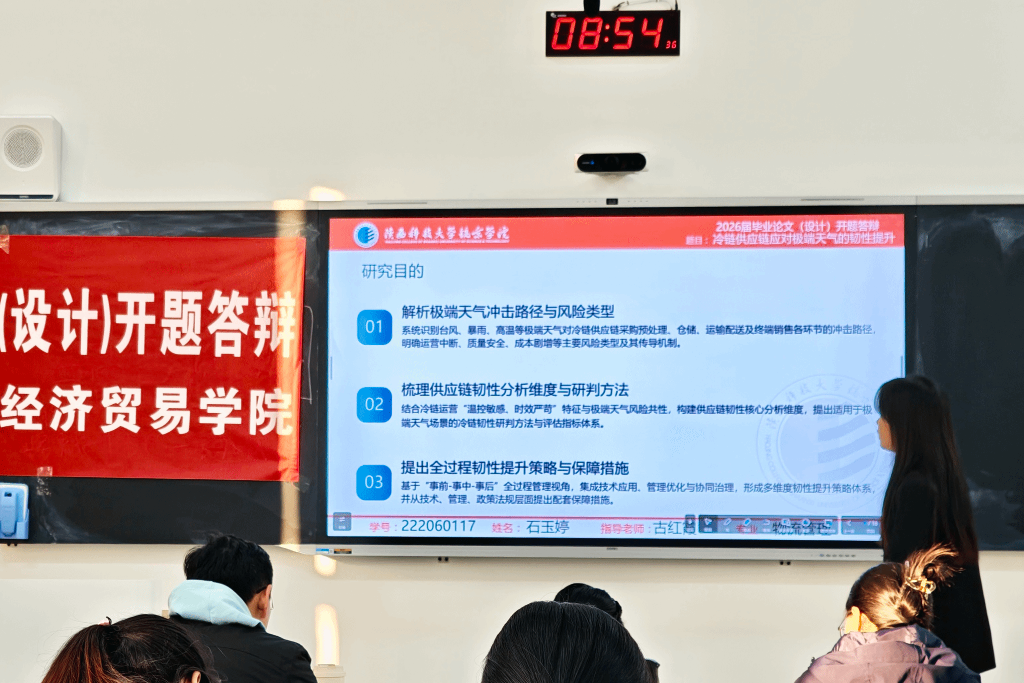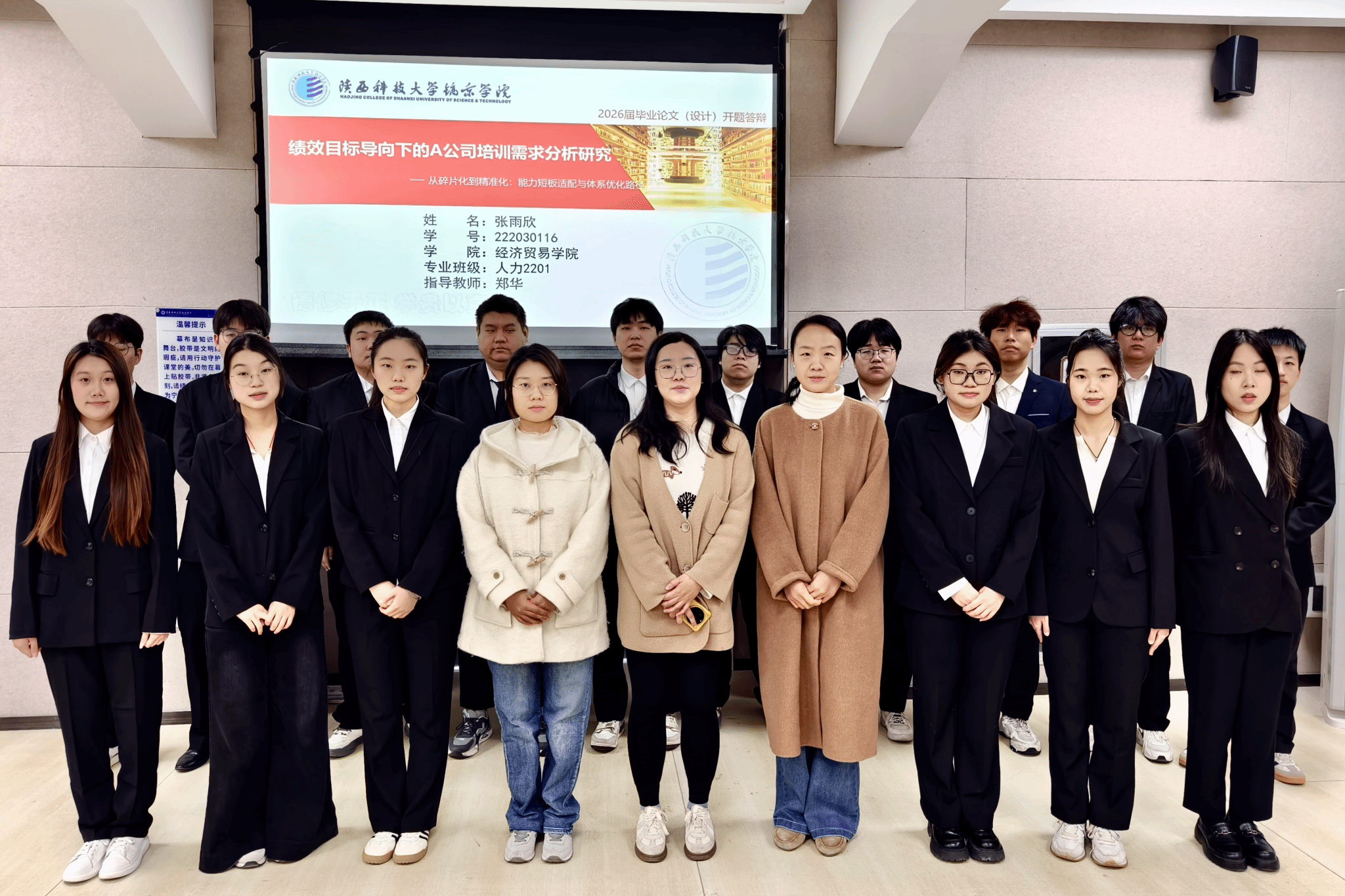 本次开题答辩构建了“展示-质询-评估-反馈”的闭环评议流程。在答辩现场,学生需系统阐述选题的现实依据、核心研究框架与具体研究方法。评审教师则基于专业培养的能力目标,重点评估其问题意识、逻辑构建及方案可行性,并提出针对性强的修改意见。整个过程不仅是开题报告的评审,更成为一次深度的学术训练与研究方法指导,确保后续论文撰写方向正确、路径清晰。