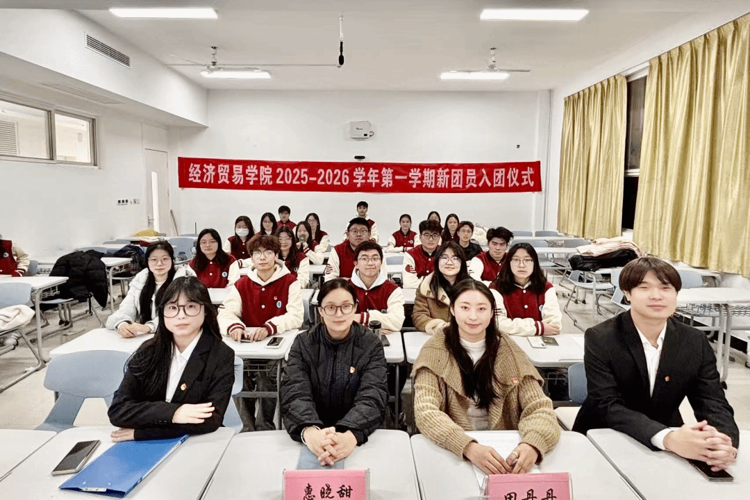 经济贸易学院2025-2026学年入团仪式为进一步夯实共青团组织根基,增强新团员的光荣感与使命感,引导青年学子锚定理想信念、传承红色基因,2025年12月1日,经济贸易学院团总支于教学楼318教室隆重举办2025-2026学年第一学期新团员入团仪式。新团员们怀揣热忱齐聚一堂,在庄重的仪式中完成从青年到共青团员的身份蜕变,开启青春奋斗的崭新征程。佩戴团徽,镌刻使命担当仪式在雄壮的国歌声中拉开序幕,全体师生肃立致敬,齐唱国歌,以昂扬姿态抒发对祖国的赤诚与热爱,...